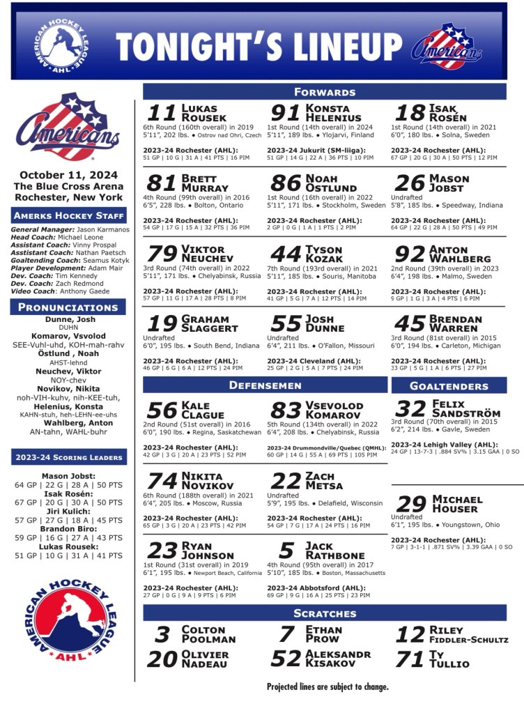 In the AHL, Tyson Kozak knocked in a third period goal off an Isak Rosen shot as Rochester opened the 2024-25 season with a 3-2 loss to Belleville. Rosen, Viktor Neuchev and Ryan Johnson added assists in defeat.